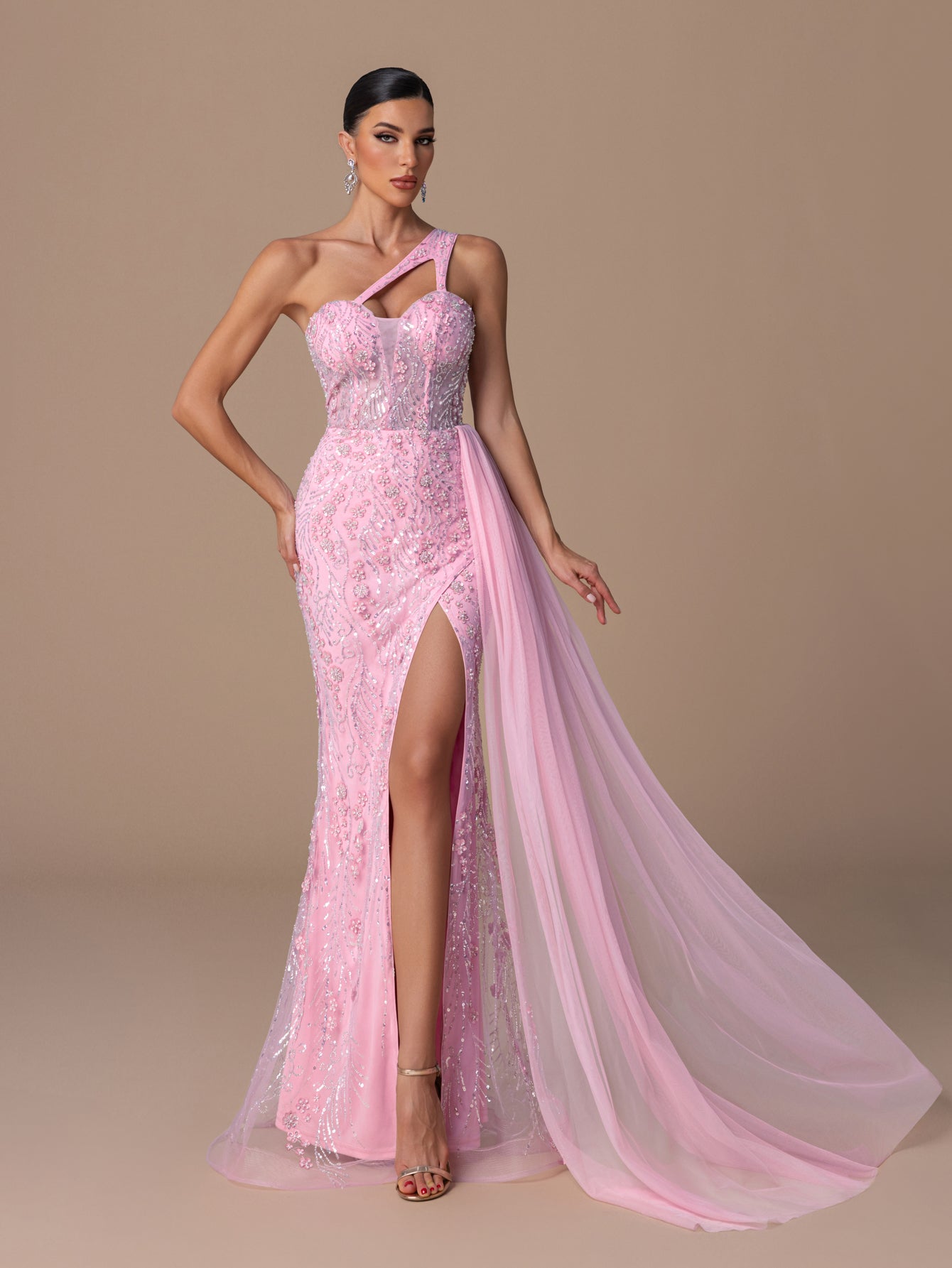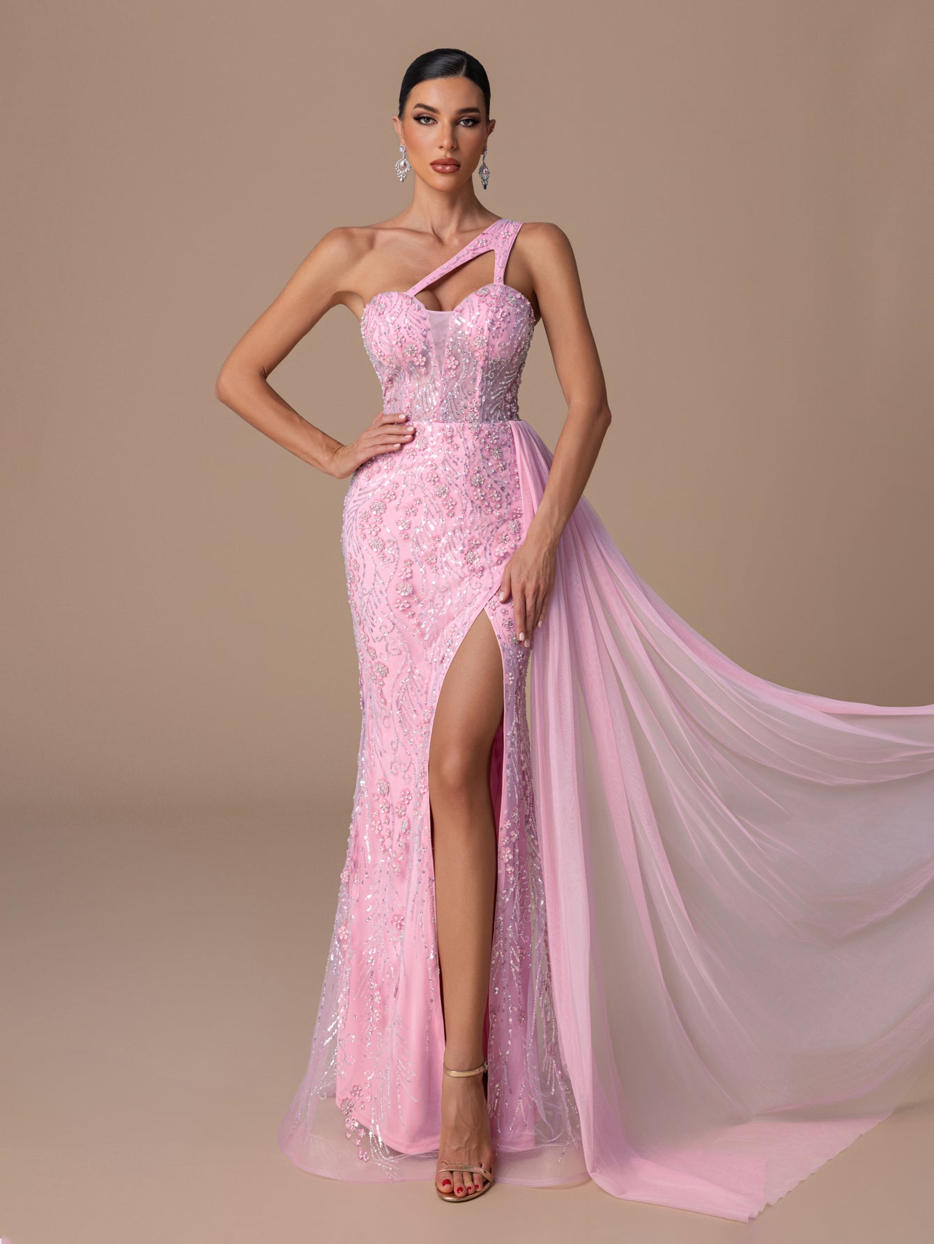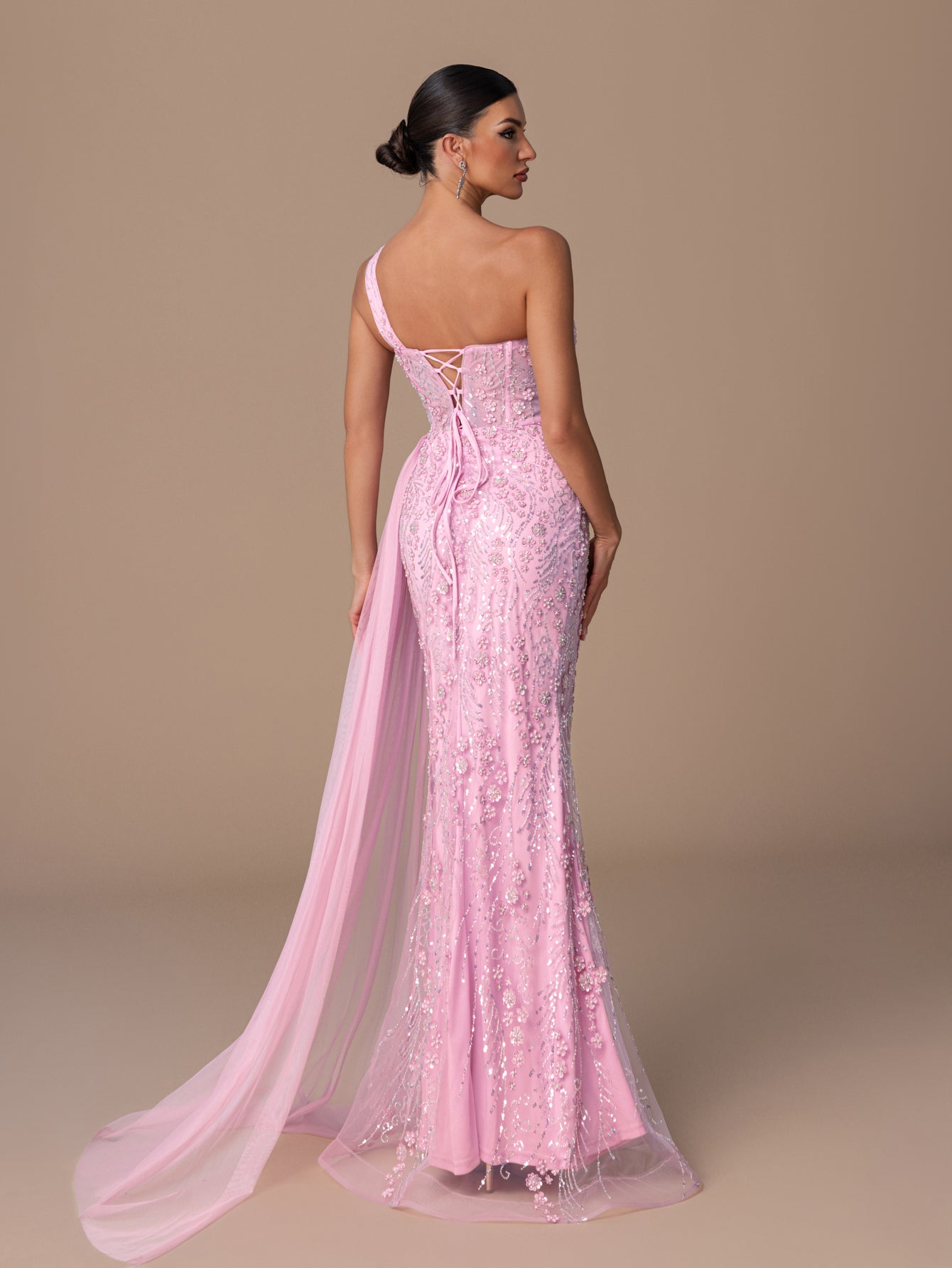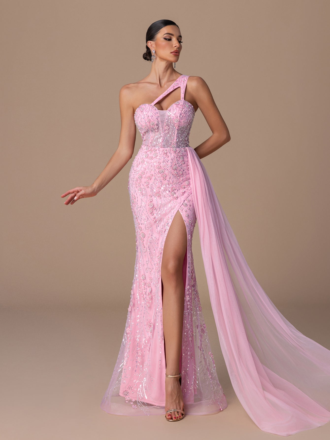 One-Shoulder Mermaid Gown with Sequins, Beads & Asymmetrical Tulle Train