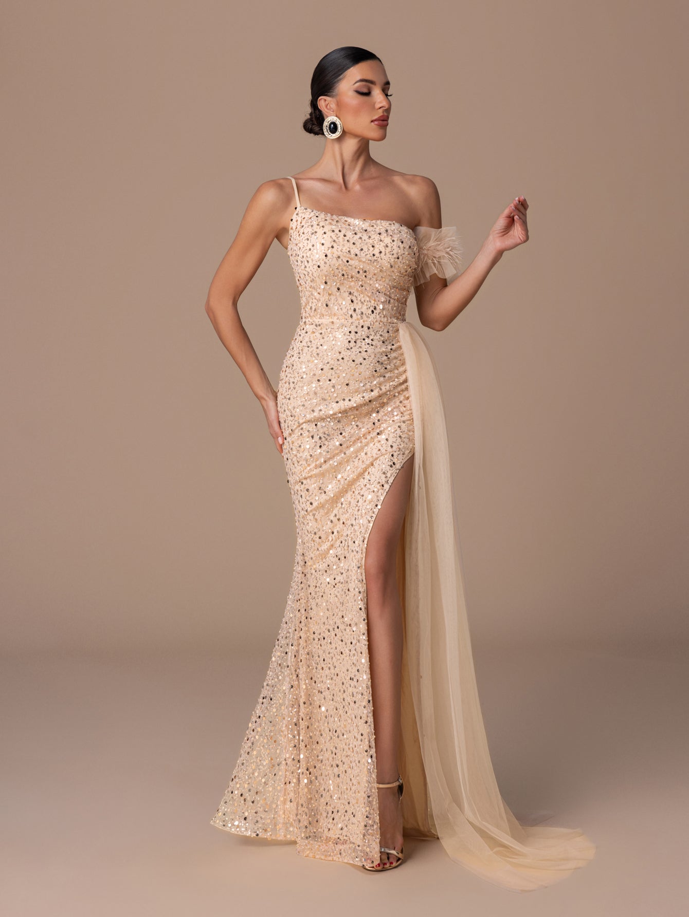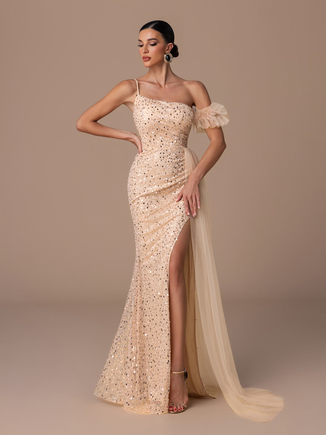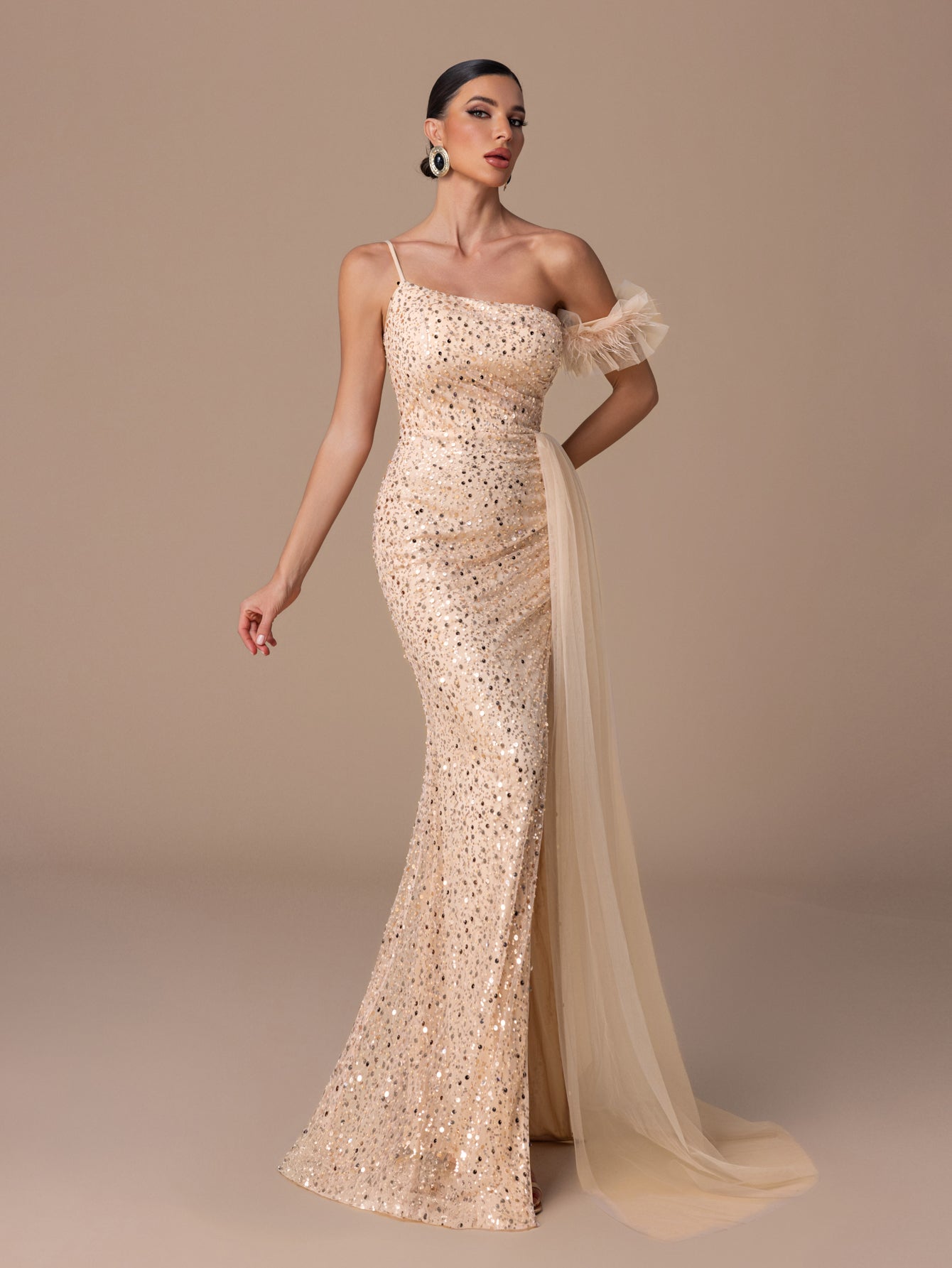 Sequin One-Shoulder Mermaid Gown with Ruffle Sleeve & Crisscross Tie-Back