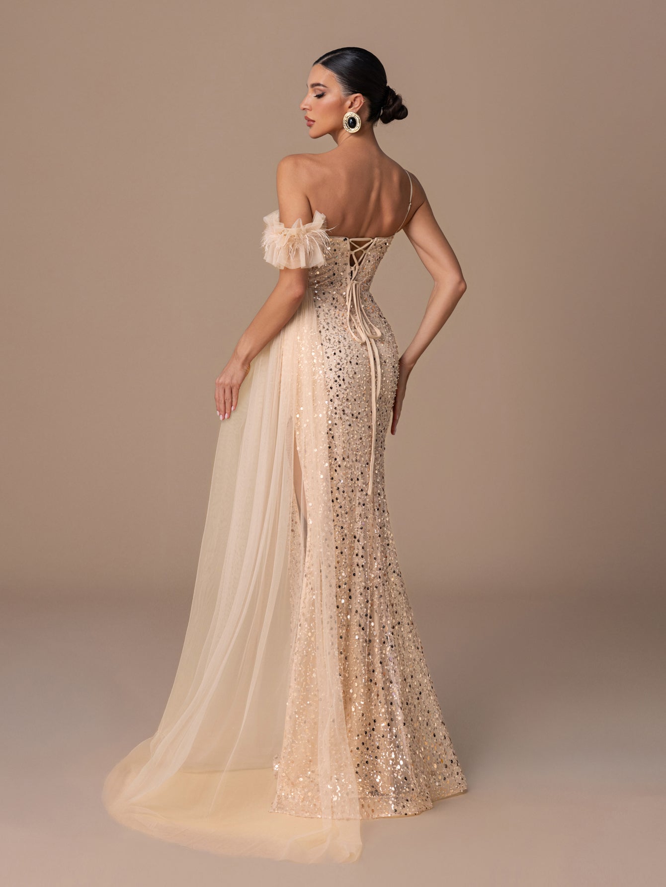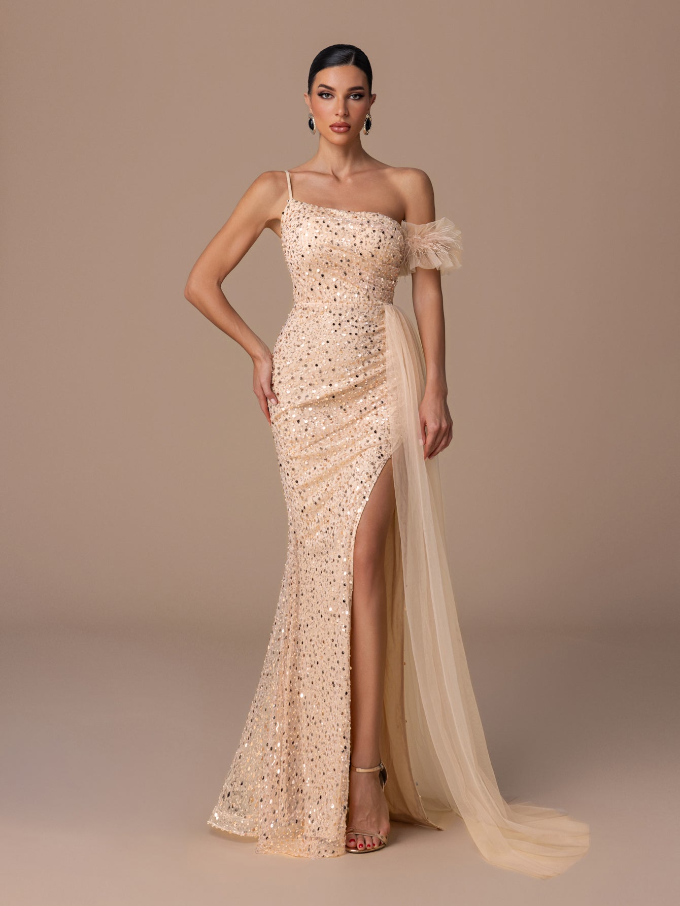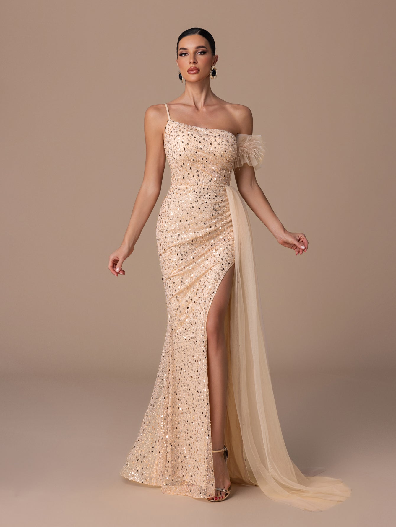 Sequin One-Shoulder Mermaid Gown with Ruffle Sleeve & Crisscross Tie-Back