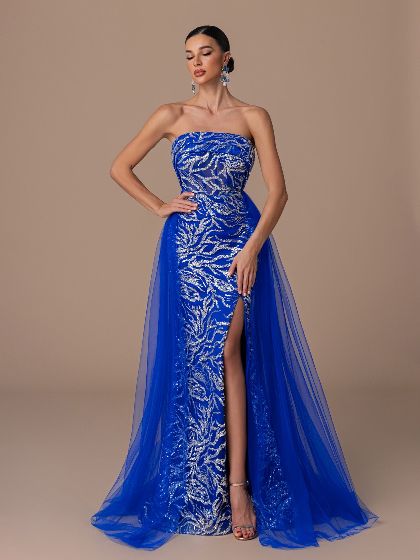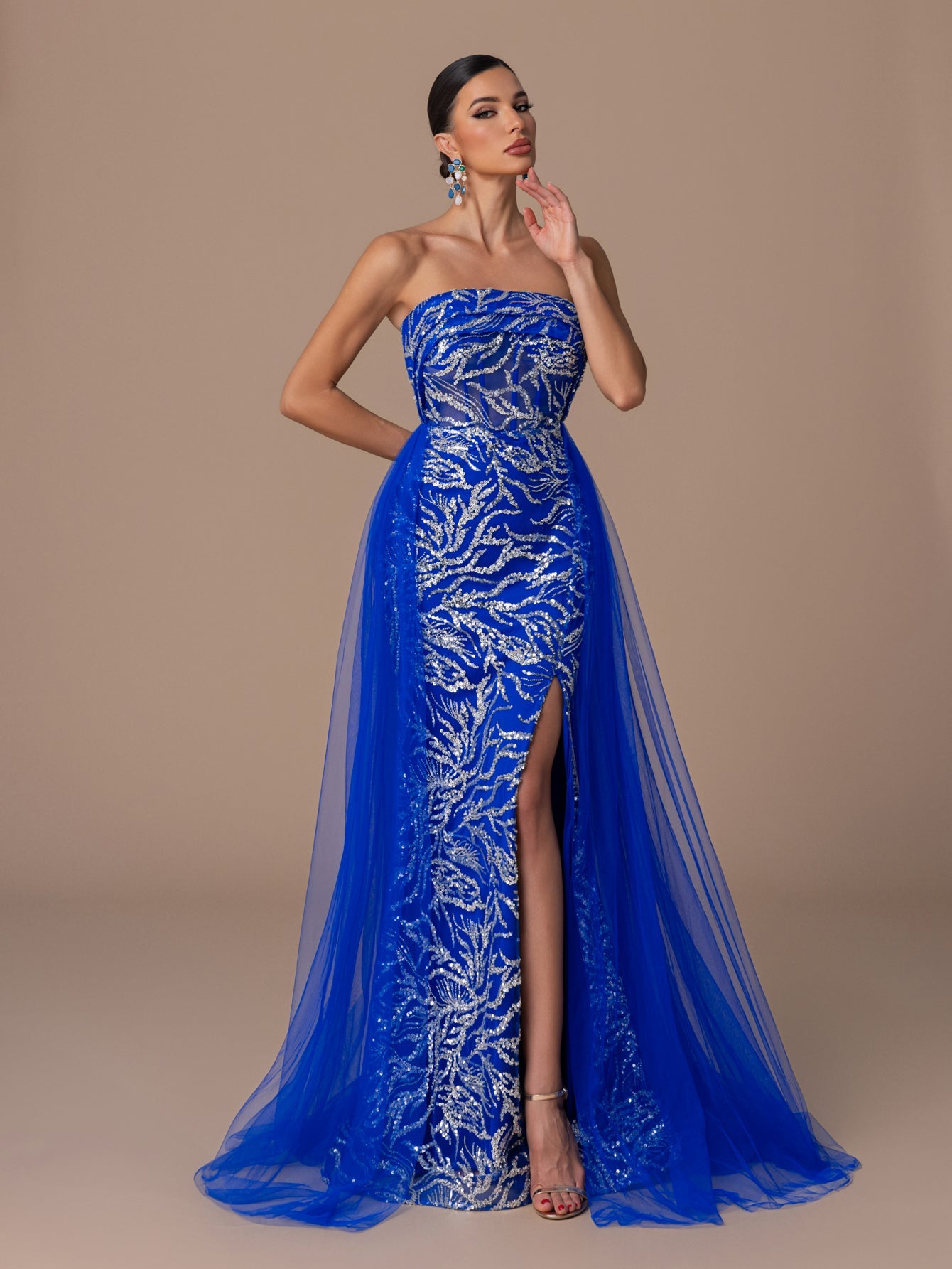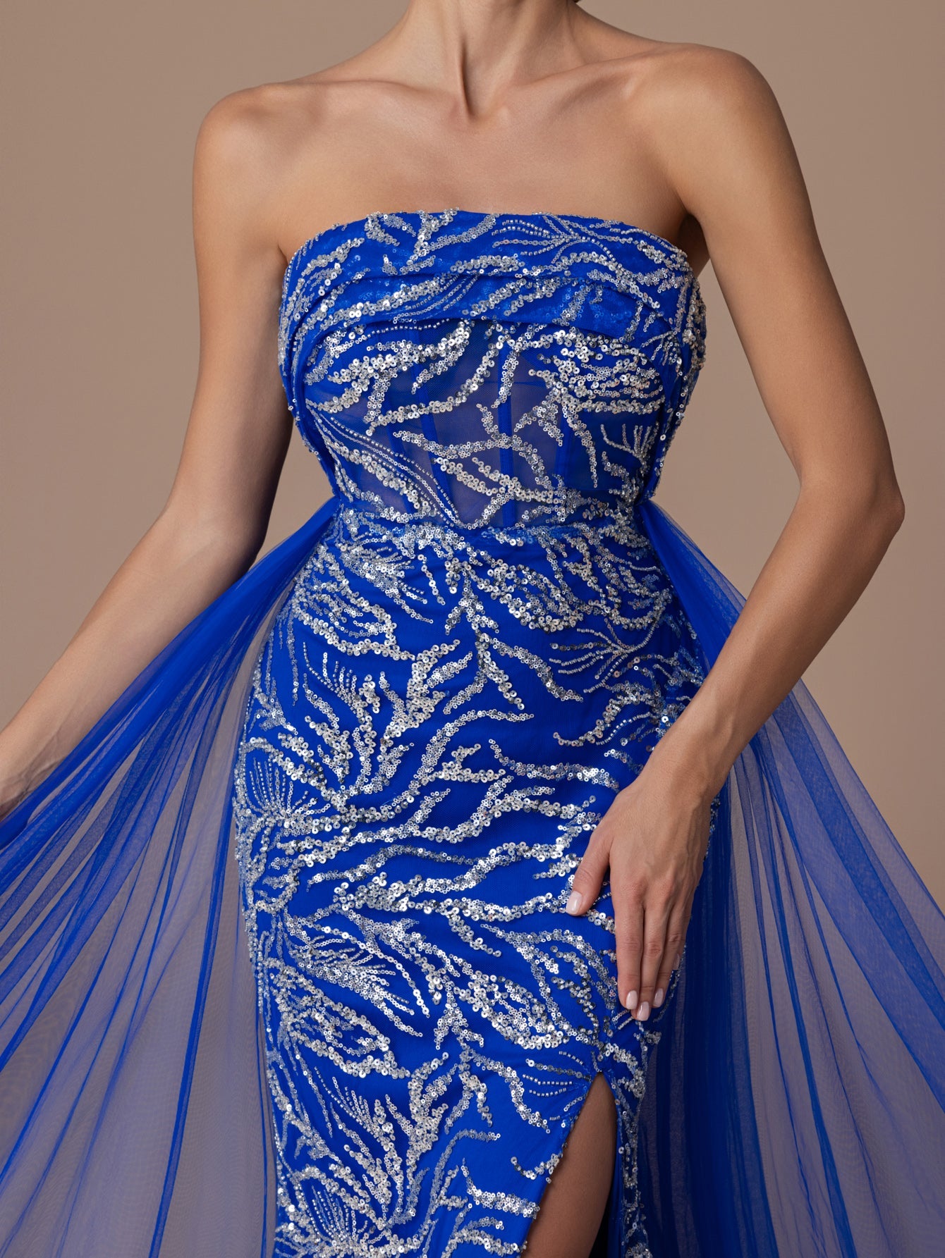 Strapless Gown with Sequins, Beaded, High Slit and Back Tie Tulle Hem