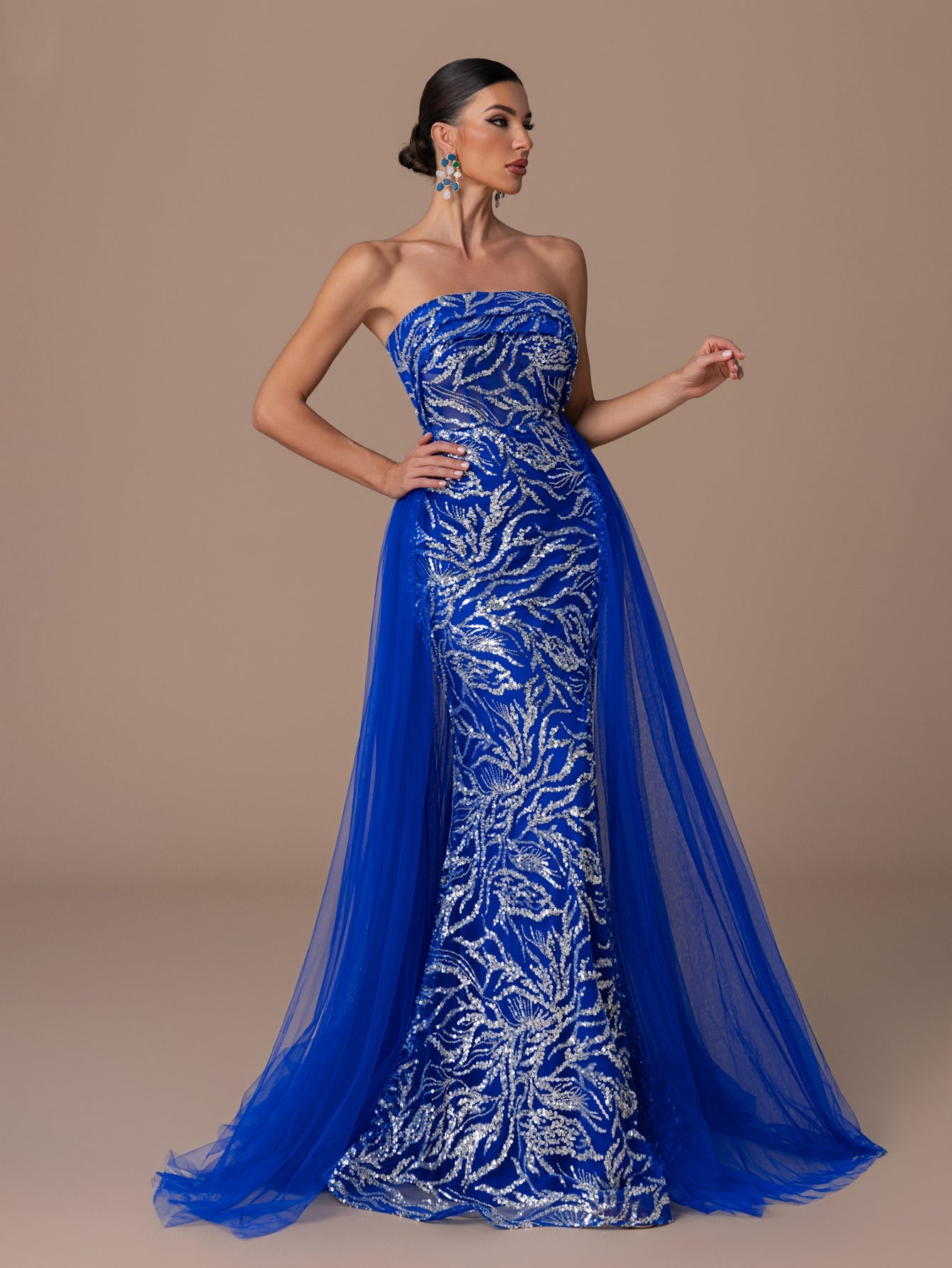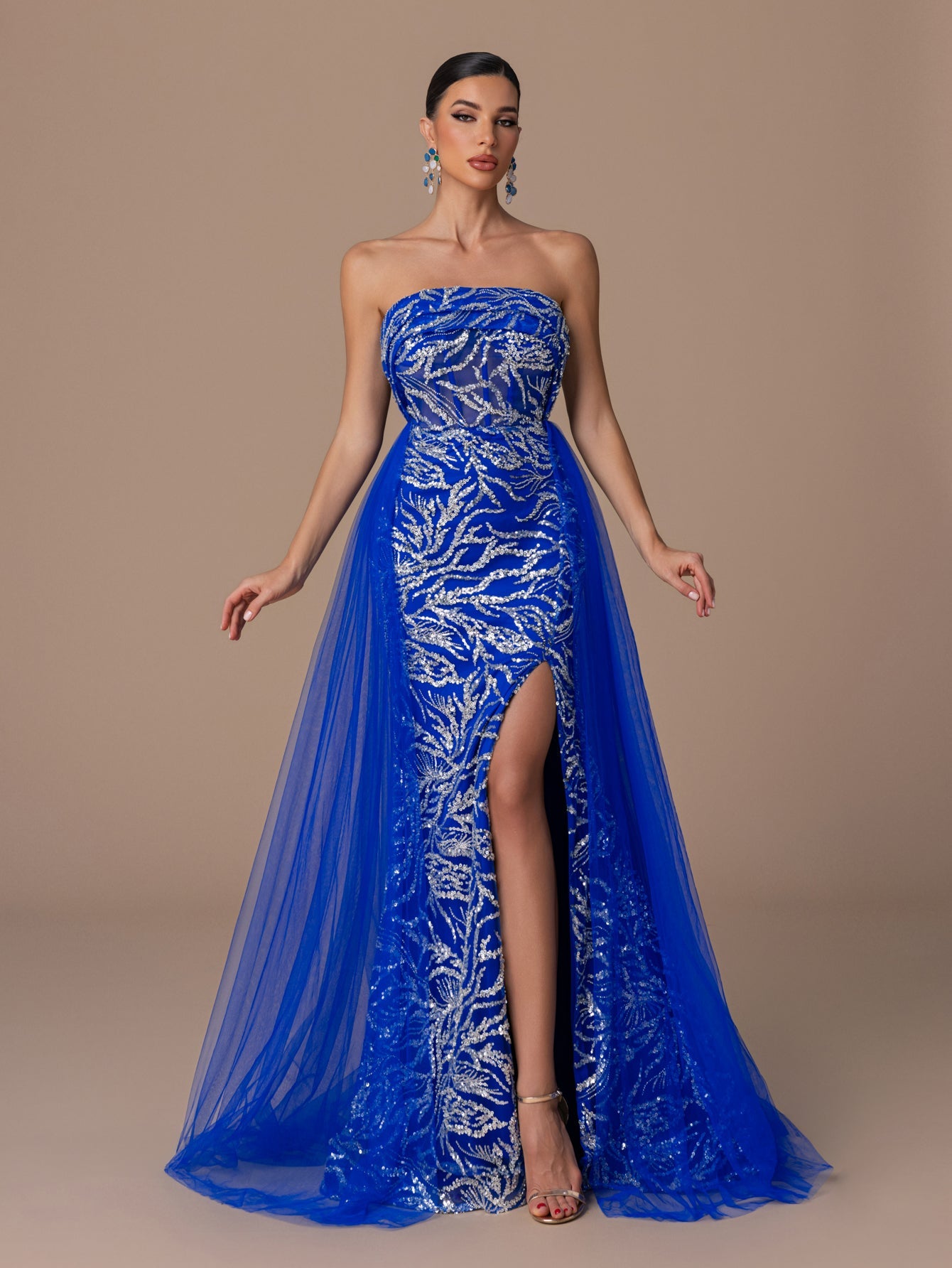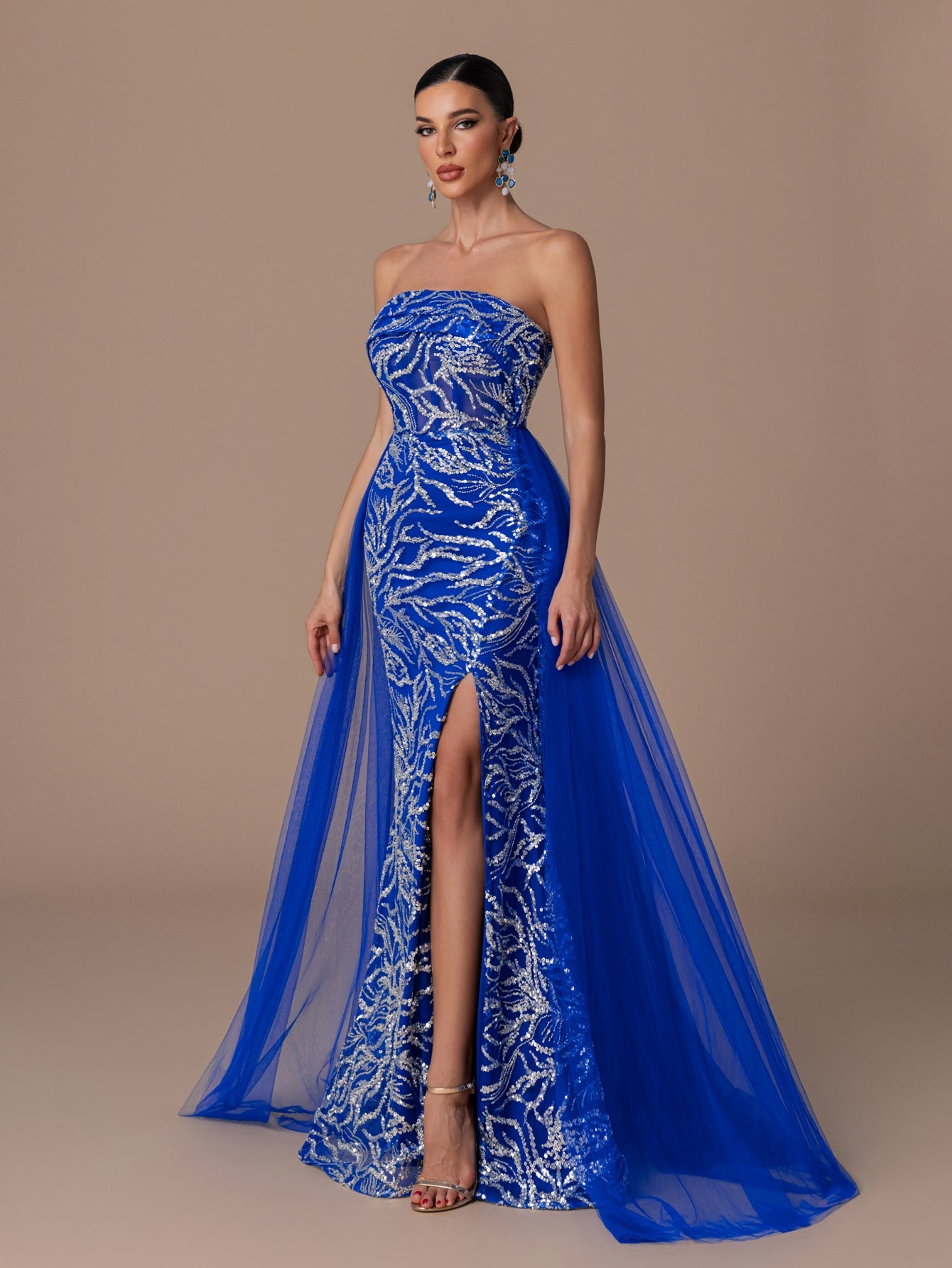 Strapless Gown with Sequins, Beaded, High Slit and Back Tie Tulle Hem