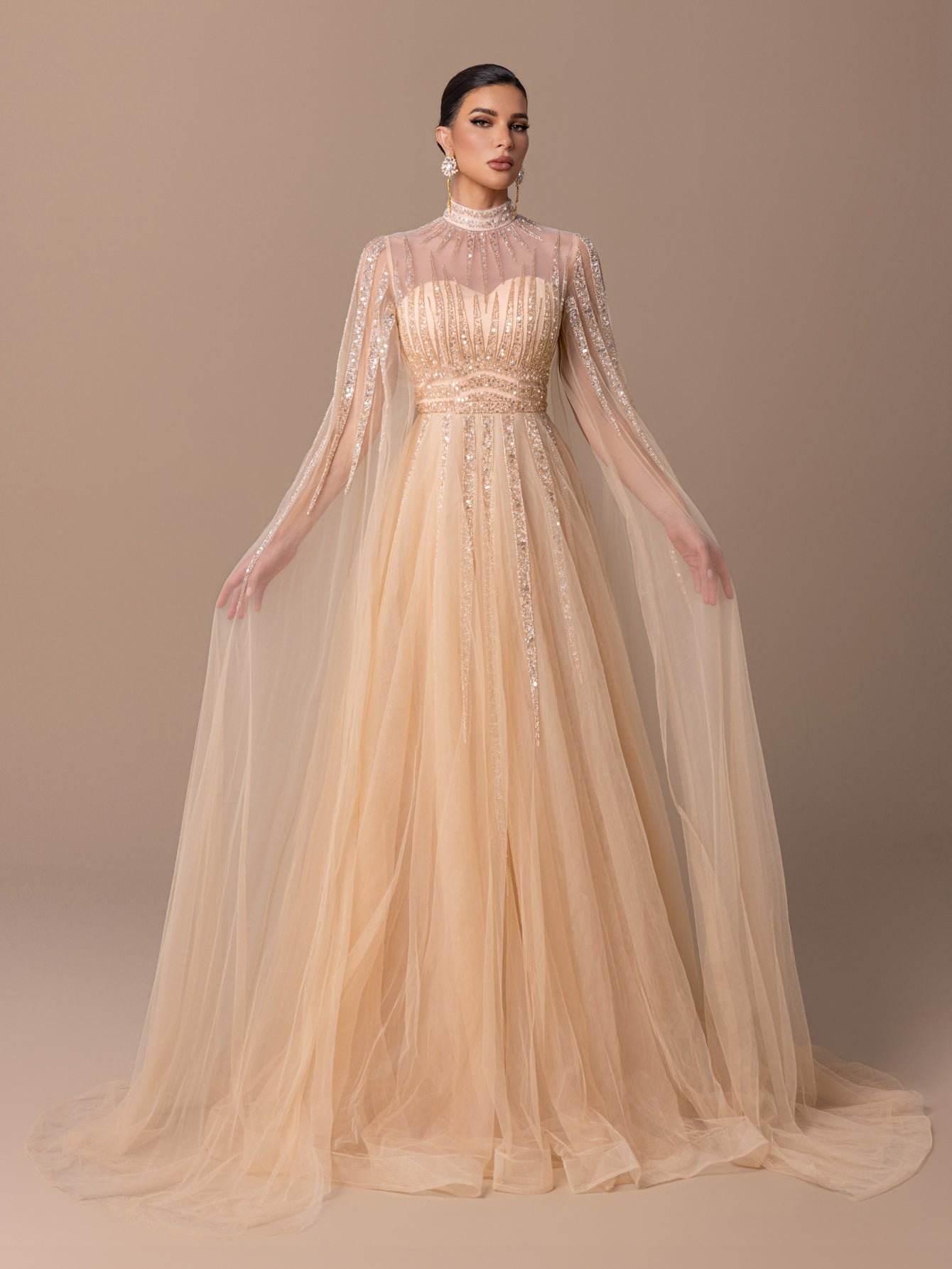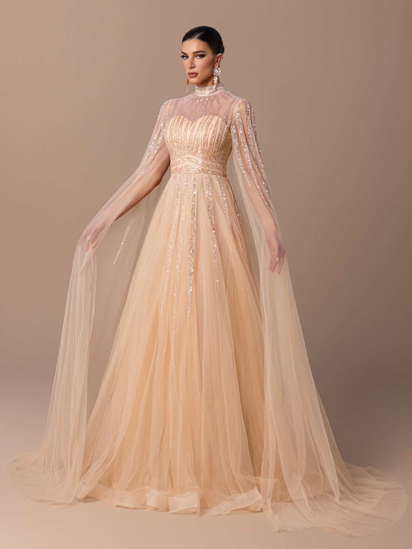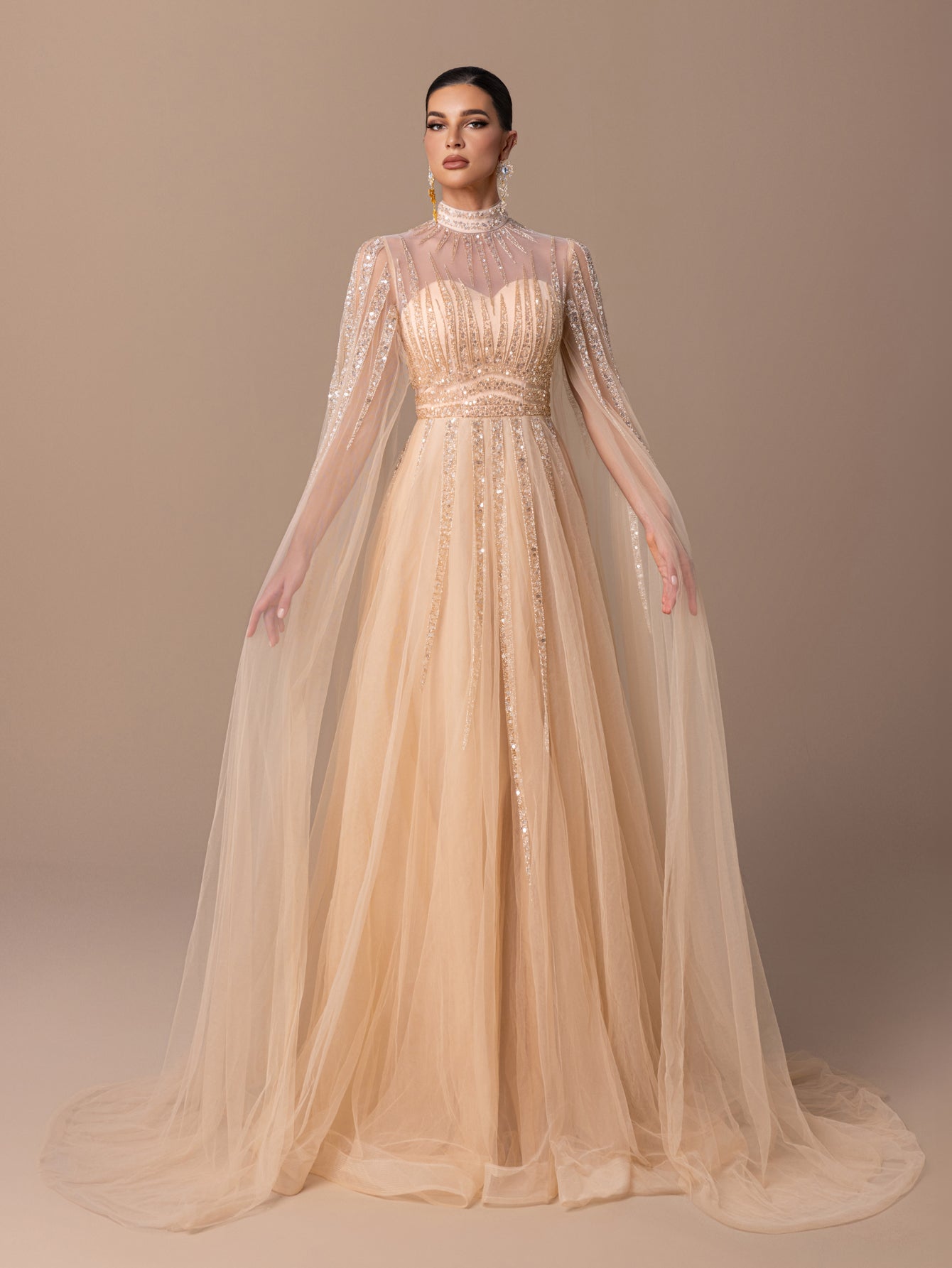 A-Line Gown with Sequins, Beads, Sheer Tulle Sleeves & Voluminous Tulle Skirt