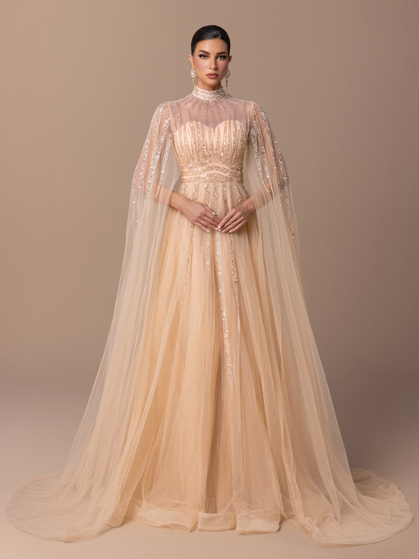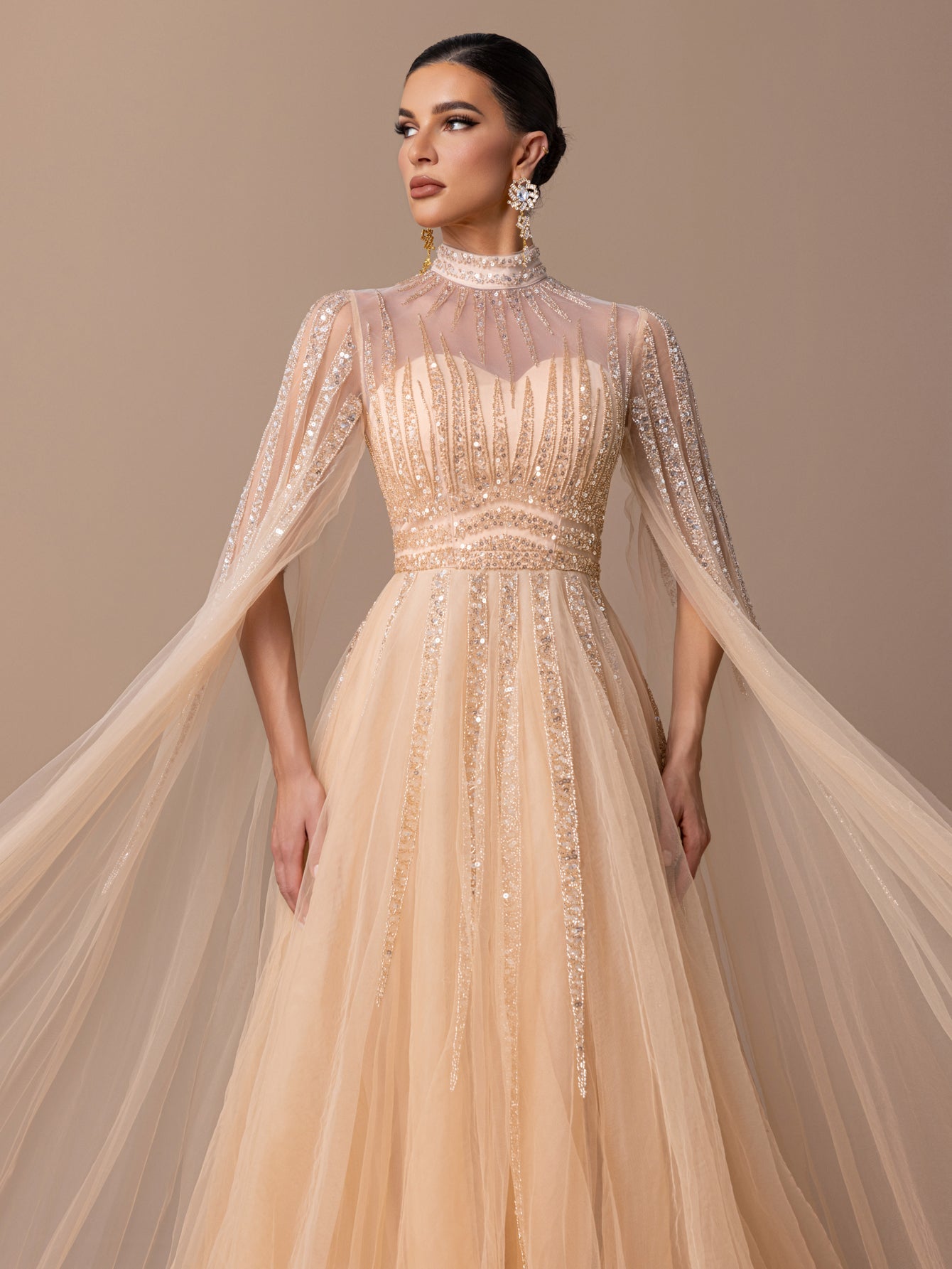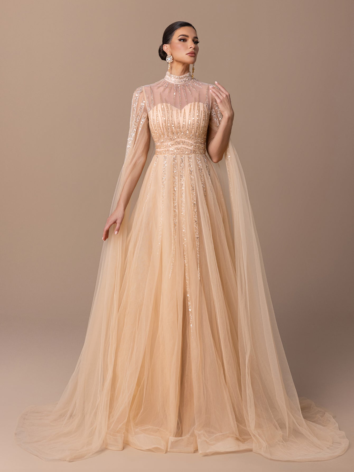 A-Line Gown with Sequins, Beads, Sheer Tulle Sleeves & Voluminous Tulle Skirt